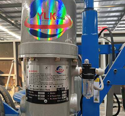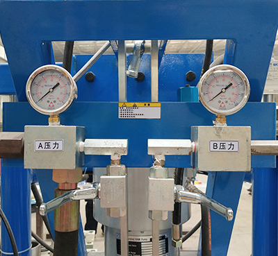 采用可調式增壓同步聯(lián)動配比機構。適應不同物料的配比要求(6:1-14:1),有專門比例檢測機構,配比調整十分方便,配比精度誤差小于±2%。